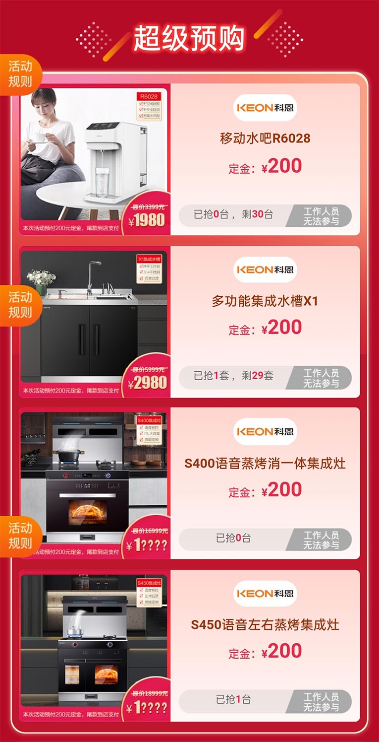 科恩蒸烤節(jié),9大禮品瘋狂秒殺,V1凈水龍頭0.99/個、章丘鐵鍋9.9/套、不銹鋼四層蒸鍋19.9/套、伯爵刀具7件套39.9/套、天貓精靈19.9/個、飛科剃須刀19.9/個、掃地機(jī)器人199/個、D115經(jīng)典消毒柜款集成灶4999/臺、D125X高端蒸烤消一體集成灶7999/臺。更有集成灶十大品牌、廚電行業(yè)十大品牌科恩集成灶超級預(yù)購產(chǎn)品,預(yù)付定金200元,移動水吧R6028僅需1980、多功能集成水槽X1僅需2980、S400語音蒸烤消一體集成灶、S450語音左右蒸烤集成灶更是瘋狂低價放送。