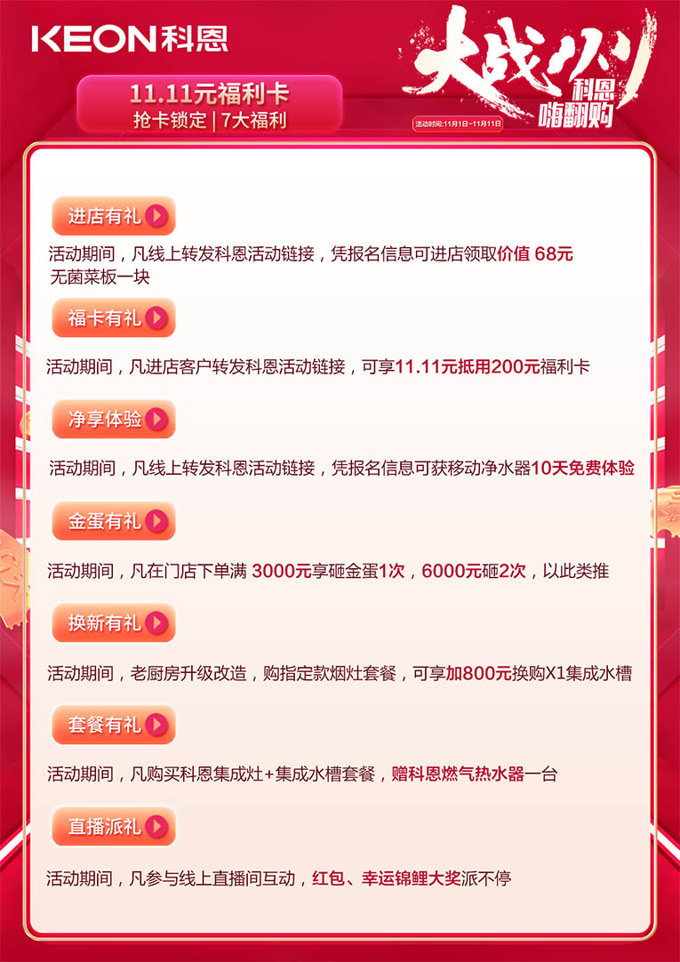 大戰(zhàn)雙11,科恩嗨翻購,11月1日——11月11日活動期間,前往科恩全國門店提前搶購11.11元福利卡,就能提前鎖定7大福利。進店有禮:活動期間,凡線上轉發(fā)科恩活動鏈接,憑報名信息可進店領取價值68元無菌菜板一塊;??ㄓ卸Y:活動期間,凡進店客戶轉發(fā)科恩活動鏈接,可享11.11元抵用200元福利卡;凈享體驗:活動期間,凡線上轉發(fā)科恩活動鏈接,憑報名信息可獲移動凈水器10天免費體驗;金蛋有禮:活動期間,凡在門店下單滿3000元享砸金蛋1次,6000元砸2次,以此類推;換新有禮:活動期間,老廚房升級改造,購指定款煙灶套餐,可享加800元換購X1集成水槽;套餐有禮:活動期間,凡購買科恩集成灶+集成水槽套餐,贈科恩燃氣熱水器一套;直播派禮:活動期間,凡參與線上直播間互動,紅包、幸運錦鯉大獎派不停。