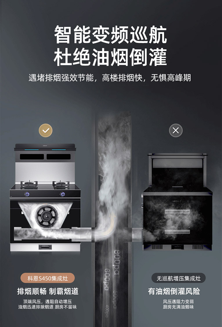 集成灶得以實(shí)現(xiàn)高效油煙吸凈率,則是源自對(duì)吸油煙方式的改變,將傳統(tǒng)上行排煙升級(jí)為側(cè)吸下排,集成灶十大品牌、廚電行業(yè)十大品牌科恩S450變頻大吸力左右蒸烤集成灶20m3/min澎湃大吸力,S級(jí)豪華轎車品質(zhì),低空封鎖油煙升騰區(qū),清爽爆炒不過(guò)臉,吸凈雙灶爆炒煙,搭載智能變頻巡航系統(tǒng),遇堵排煙強(qiáng)效節(jié)能,高樓排煙快,無(wú)懼高峰期。