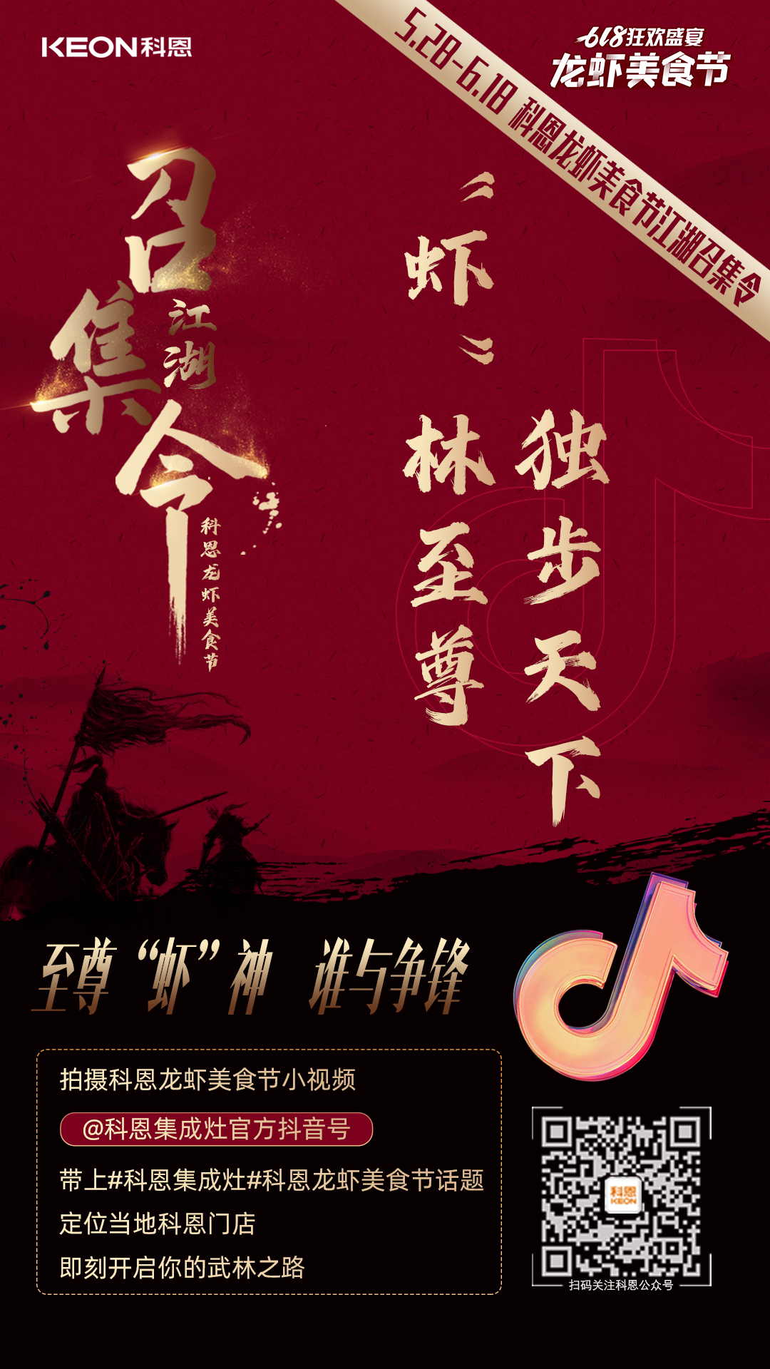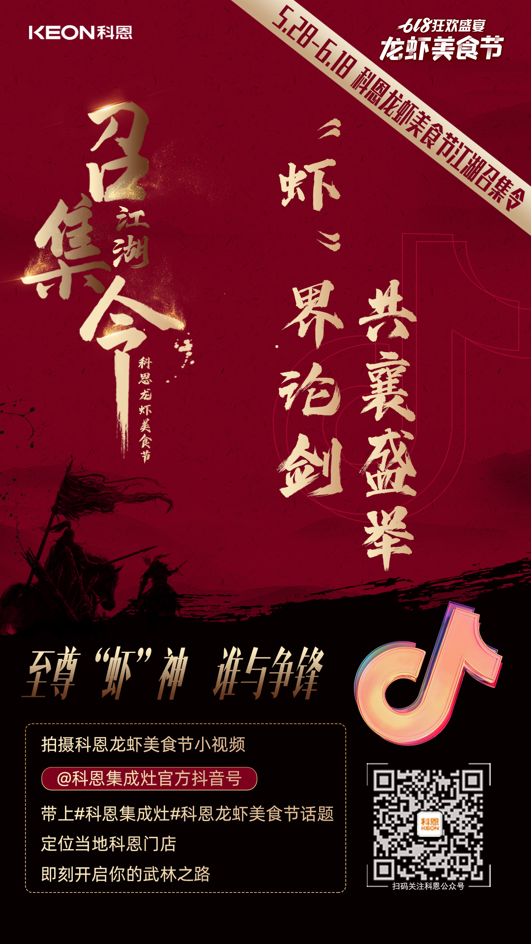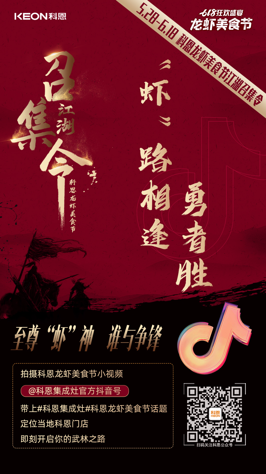 有人的地方就有江湖,有江湖的地方必有小龍蝦!有蝦有酒有江湖,快意人生,痛快自在!528-618日科恩集成灶廣發(fā)江湖召集令,誠邀天下俠士參加「科恩龍蝦美食節(jié)抖音短視頻大賽」,赴一場武林之約,角逐至尊“蝦”神之位!
