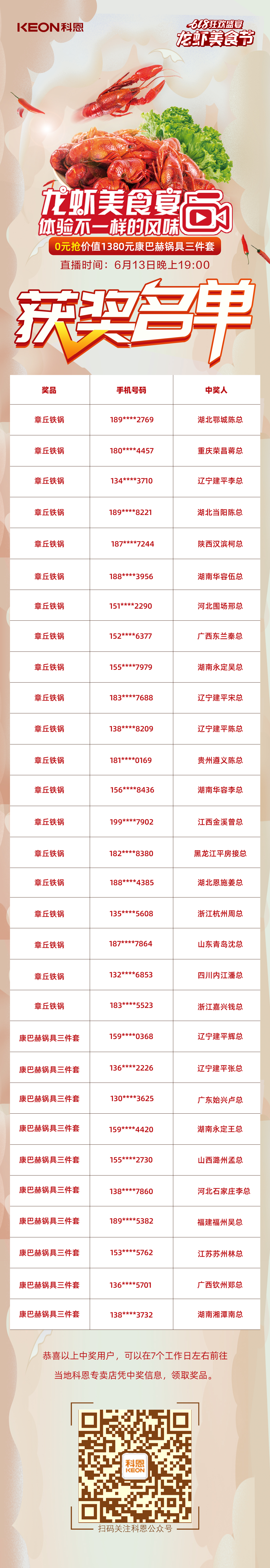 為回饋消費(fèi)者的支持與厚愛(ài),科恩集成灶實(shí)力寵粉,不僅推出線下龍蝦美食宴活動(dòng),更有多輪線上大抽獎(jiǎng)活動(dòng)。這么精彩的龍蝦美食節(jié)直播活動(dòng),你參與了嗎?1元薅羊毛的機(jī)會(huì)你搶到了嗎?快來(lái)看看這期中獎(jiǎng)名單,有你嗎?