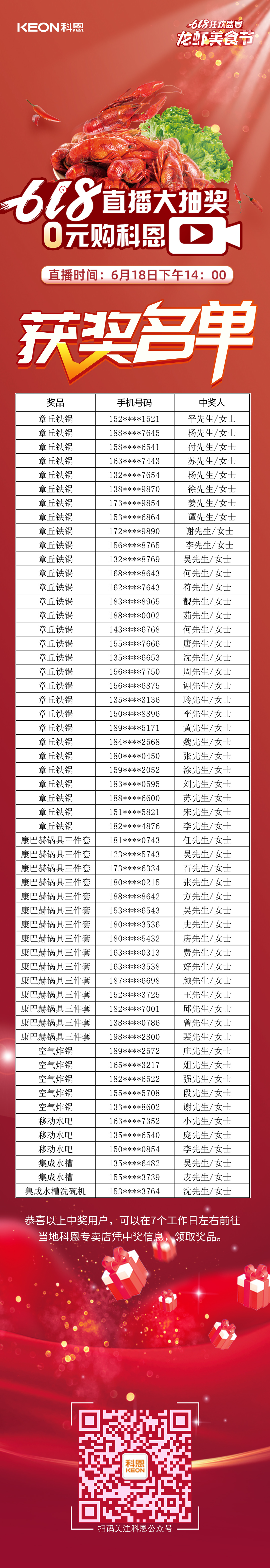 萬人品美食,0元搶科恩——科恩龍蝦美食節(jié)圓滿落幕,千城千店,共襄盛舉,感謝大家對科恩集成灶的大力支持,618直播大抽獎(jiǎng)獲獎(jiǎng)名單火熱出爐,恭喜以上獲獎(jiǎng)的小伙伴們,請盡快聯(lián)系當(dāng)?shù)?a href="http://m.jx-ygmy.com/" target="_blank">科恩門店,快把獎(jiǎng)品領(lǐng)回家吧!
