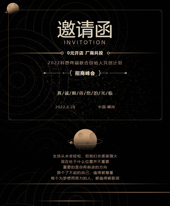生活從未變輕松,但我們會(huì)逐漸強(qiáng)大,現(xiàn)在處于什么位置并不重要,重要的是你將前進(jìn)的方向,那個(gè)了不起的自己,值得被尊重,每個(gè)為夢(mèng)想而努力的人,都值得被歌頌!誠(chéng)邀您參加2022年6月28日在浙江嵊州,由浙江科恩電器有限公司主辦的「0元開(kāi)店,廠商共投」2022年科恩終端聯(lián)合創(chuàng)始人共創(chuàng)計(jì)劃暨招商峰會(huì),并真誠(chéng)期望我們于此次活動(dòng)共享藍(lán)海市場(chǎng)商業(yè)機(jī)會(huì)的同時(shí),商討雙方企業(yè)發(fā)展策略,共同揭開(kāi)科恩集成灶品牌的神秘面紗。