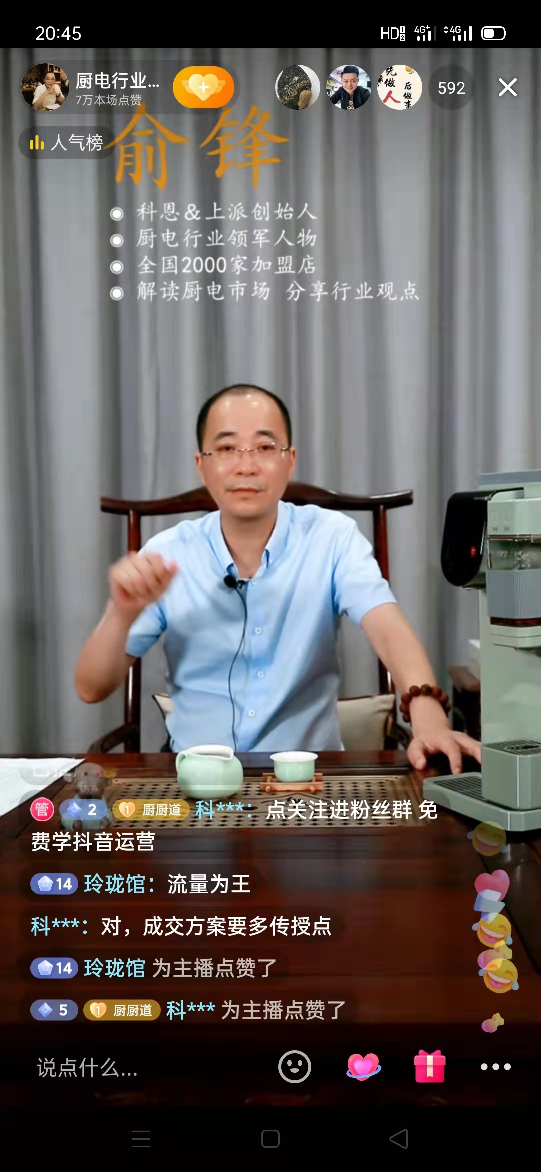 直播從19:30準(zhǔn)時(shí)開始,俞總在大家的萬眾期待中閃耀亮相,集團(tuán)董事、廚電大咖效應(yīng)使得眾多業(yè)內(nèi)外精英及投資創(chuàng)業(yè)者紛紛進(jìn)入直播間聆聽取經(jīng),同時(shí),豐富的直播福利和俞總娓娓道來、由淺入深的商業(yè)思維也提升了大眾的參與度,引起了用戶對于目前經(jīng)濟(jì)形勢的廣泛關(guān)注和討論,可以說,這是一場具有戰(zhàn)略性、前瞻性、針對性的行業(yè)直播盛宴。