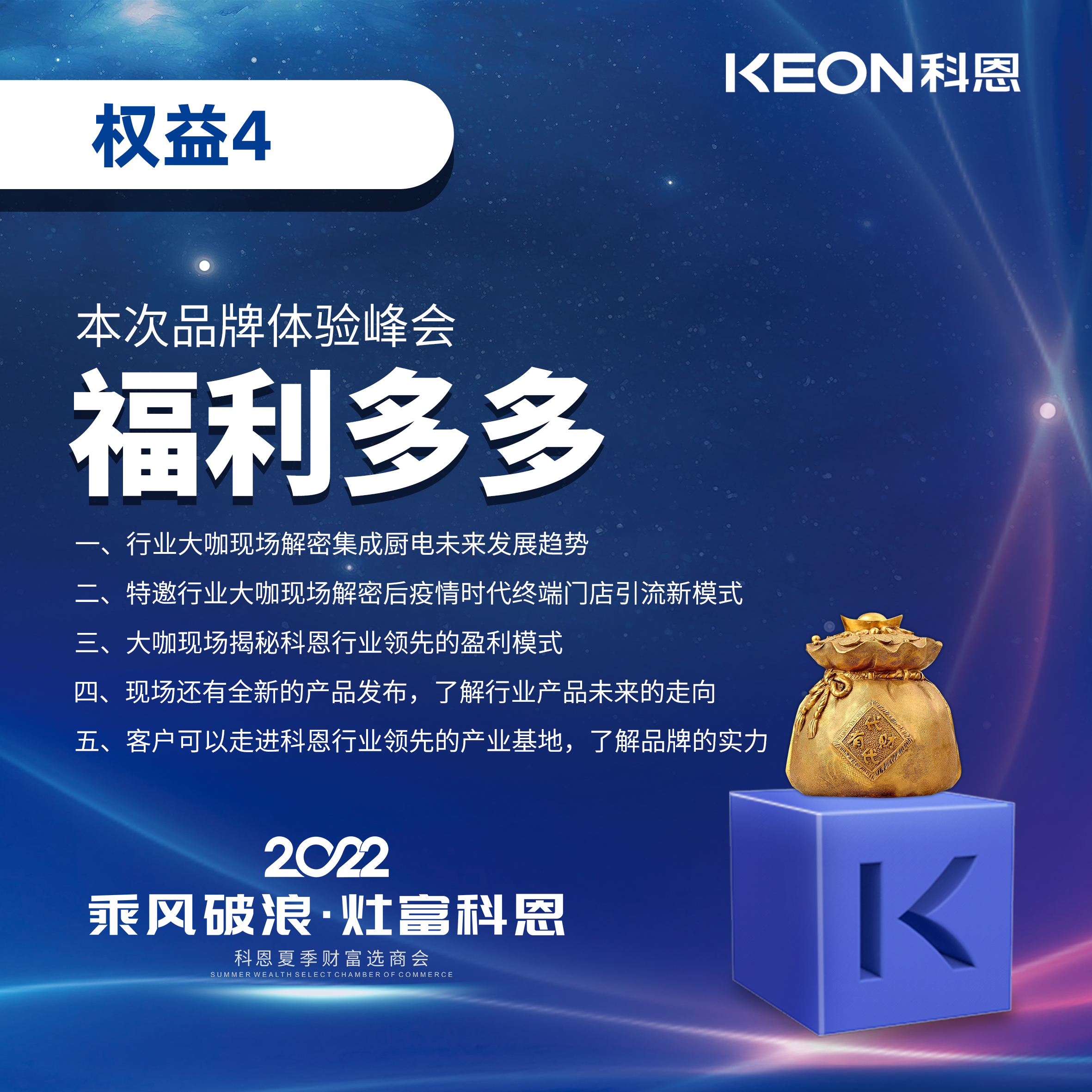 【乘風(fēng)破浪·灶富科恩】——2022科恩夏季財富選商會將于7月27日在廚具之都嵊州隆重開啟,屆時將廣邀廚電行業(yè)資深大咖、業(yè)界菁英齊聚一堂,共同探討廚電行業(yè)發(fā)展之路的機遇和挑戰(zhàn),開創(chuàng)行業(yè)新賽道,更有專屬六大特權(quán),把握機會,緊握財富之手,六大權(quán)益,共享巨擘商機,趁現(xiàn)在,贏未來!