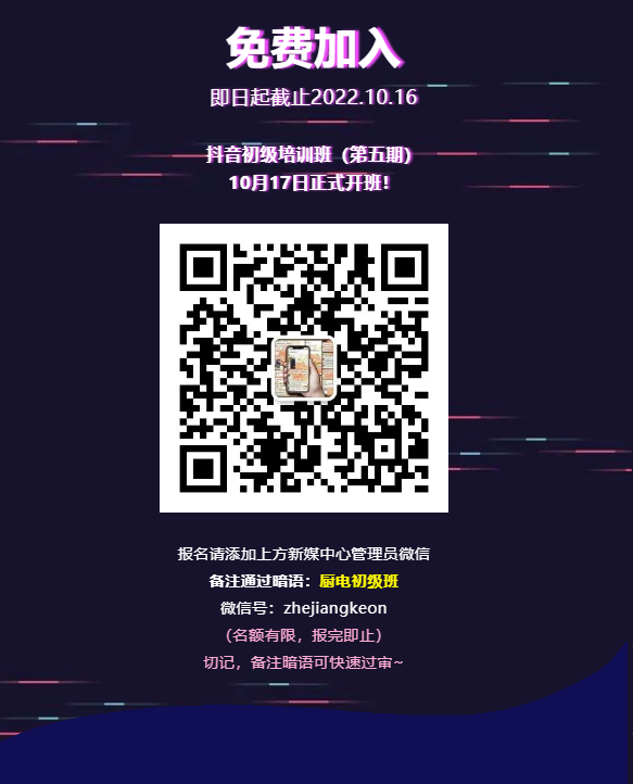 目前,第五期抖音實(shí)戰(zhàn)訓(xùn)練營初級班已全面啟動,欲報從速!歡迎在此留言報名或者添加科恩新媒體官方微信搶占名額!科恩新媒體官方微信:zhejiangkeon