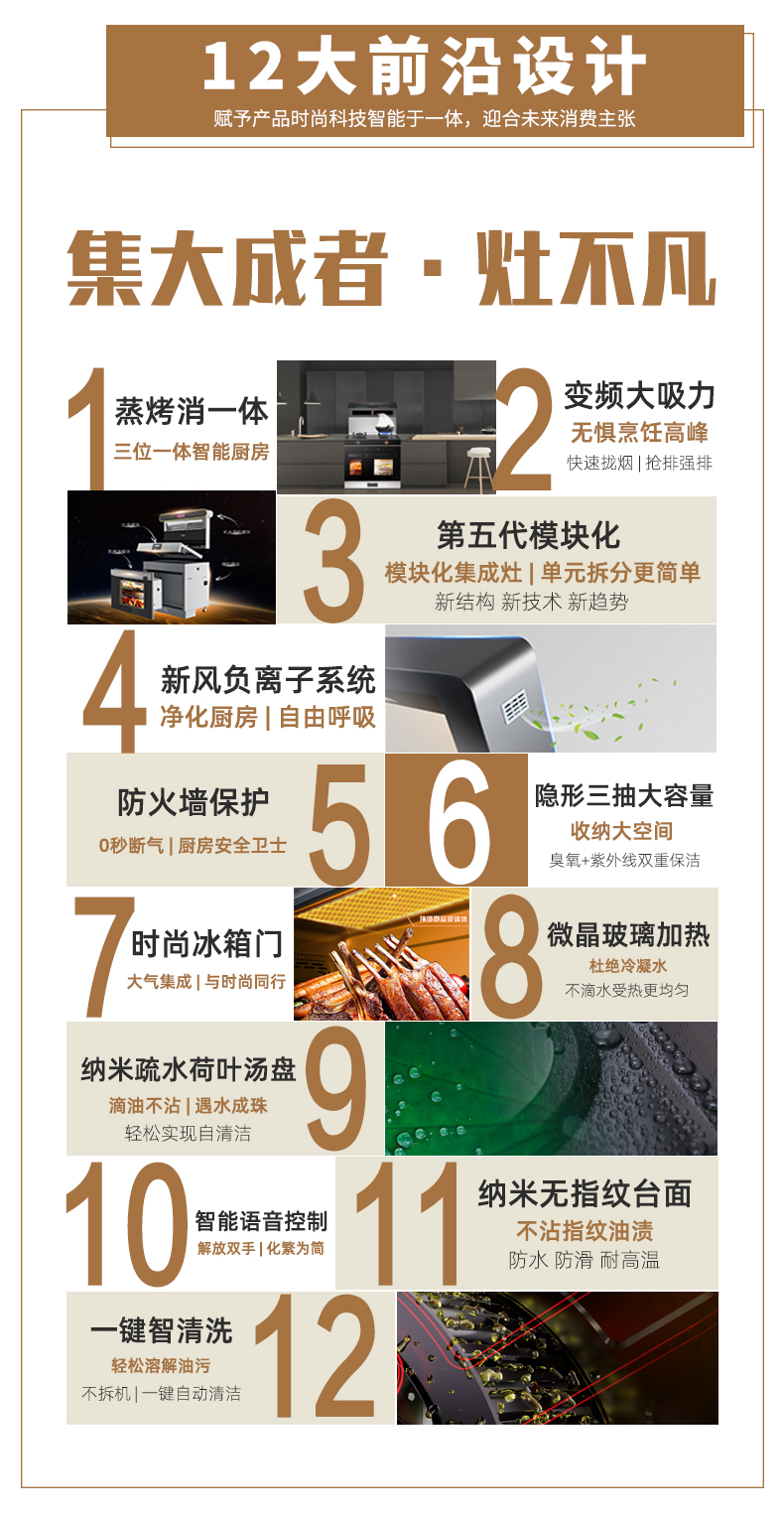 產(chǎn)品好不好,要看用戶的滿意度,科恩集成灶時(shí)刻洞察用戶需求變化,在產(chǎn)品研發(fā)上不斷發(fā)力,以變頻大吸力、第五代模塊化、智能語(yǔ)音互聯(lián)、蒸烤消一體、左右蒸烤、微晶玻璃加熱、納米疏水荷葉湯盤(pán)、納米無(wú)指紋臺(tái)面、一鍵智清洗等12大差異化前沿技術(shù),實(shí)現(xiàn)多項(xiàng)性能提升突破,為用戶帶去“樂(lè)享智慧烹飪”廚房新體驗(yàn)。