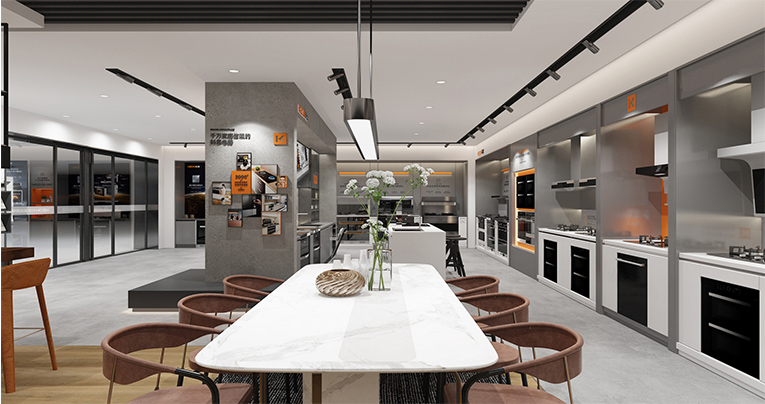 科恩新門店簡約、大氣、精美的視覺沖擊讓人印象深刻,開放式瀏覽路徑,通過“視覺+產(chǎn)品+體驗(yàn)”的融合,以差異化彰顯品牌個性,讓消費(fèi)者通過感知產(chǎn)品來感受品牌,對多個區(qū)域進(jìn)行場景重構(gòu),產(chǎn)品陳列區(qū)、廚房場景、品牌背書、洽談區(qū)等,通過模塊化的方式,將核心產(chǎn)品模塊以及開放式廚房體驗(yàn)場景植入門店,體現(xiàn)了更具應(yīng)用價(jià)值的“新潮牌”!
