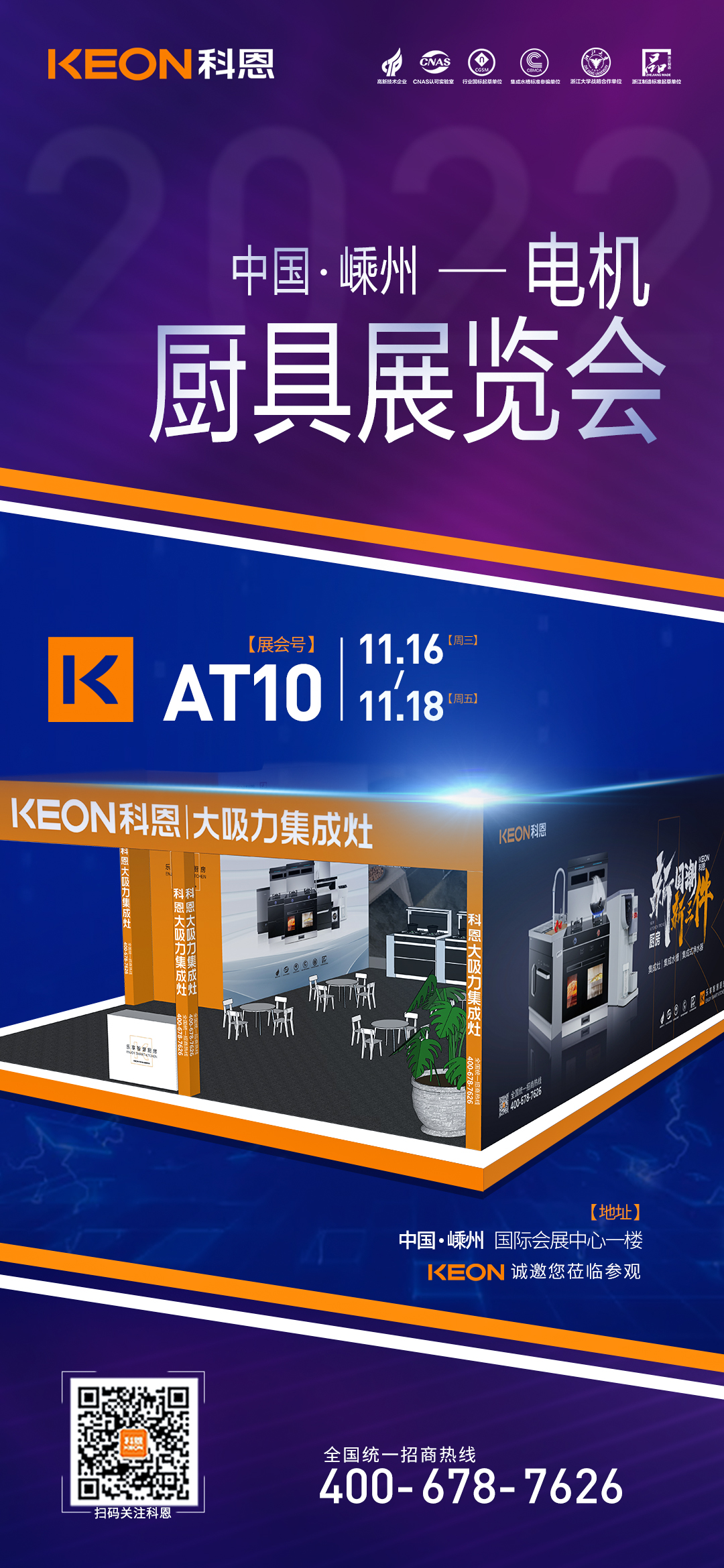 2022年11月16日-18日,第十五屆中國(guó)(嵊州)電機(jī) ·廚具展覽會(huì)將在中國(guó)廚具之都——嵊州隆重開幕,科恩集成灶作為廚電行業(yè)領(lǐng)軍品牌受邀參加本次展會(huì)(展會(huì)號(hào):AT10)