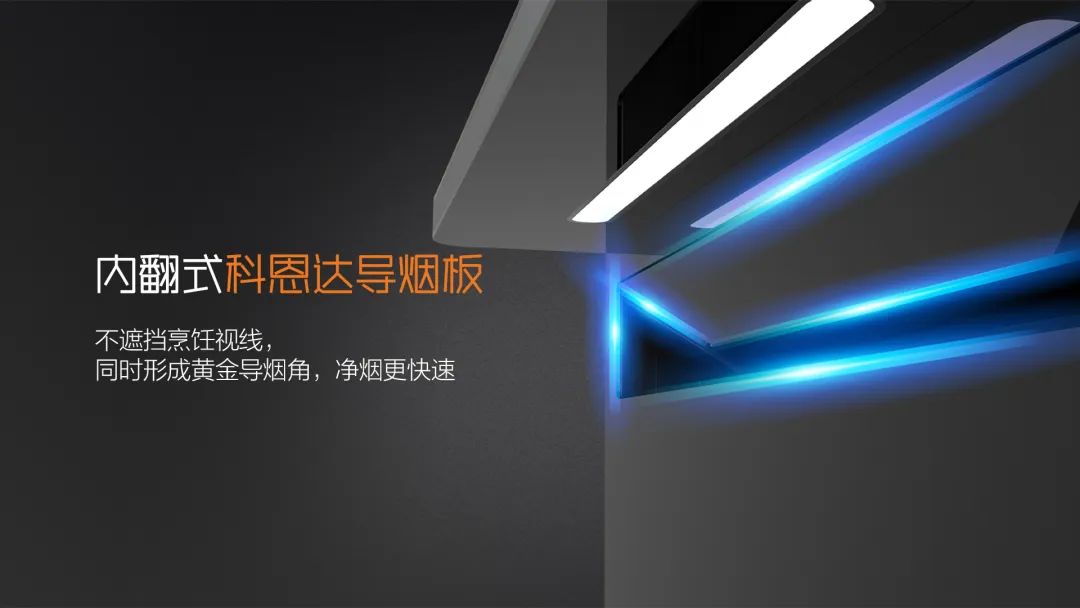 特有的內(nèi)傾科恩達(dá)導(dǎo)煙網(wǎng)板不遮擋視線,且形成獨(dú)特的吸煙黃金角,讓油煙在鍋口就被吸走,0跑煙,廚房更清新!