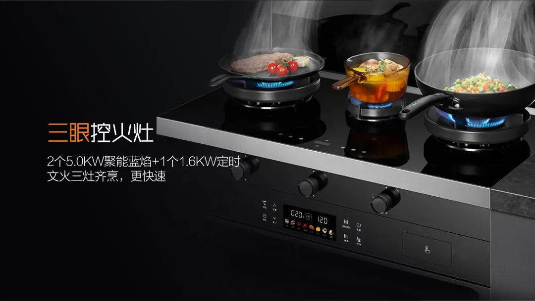 科恩A3系列獨特的三眼控火灶設(shè)置,2個5.0KW聚能藍焰+1個1.6KW定時文火,開一次火就可搞定兩菜一湯!