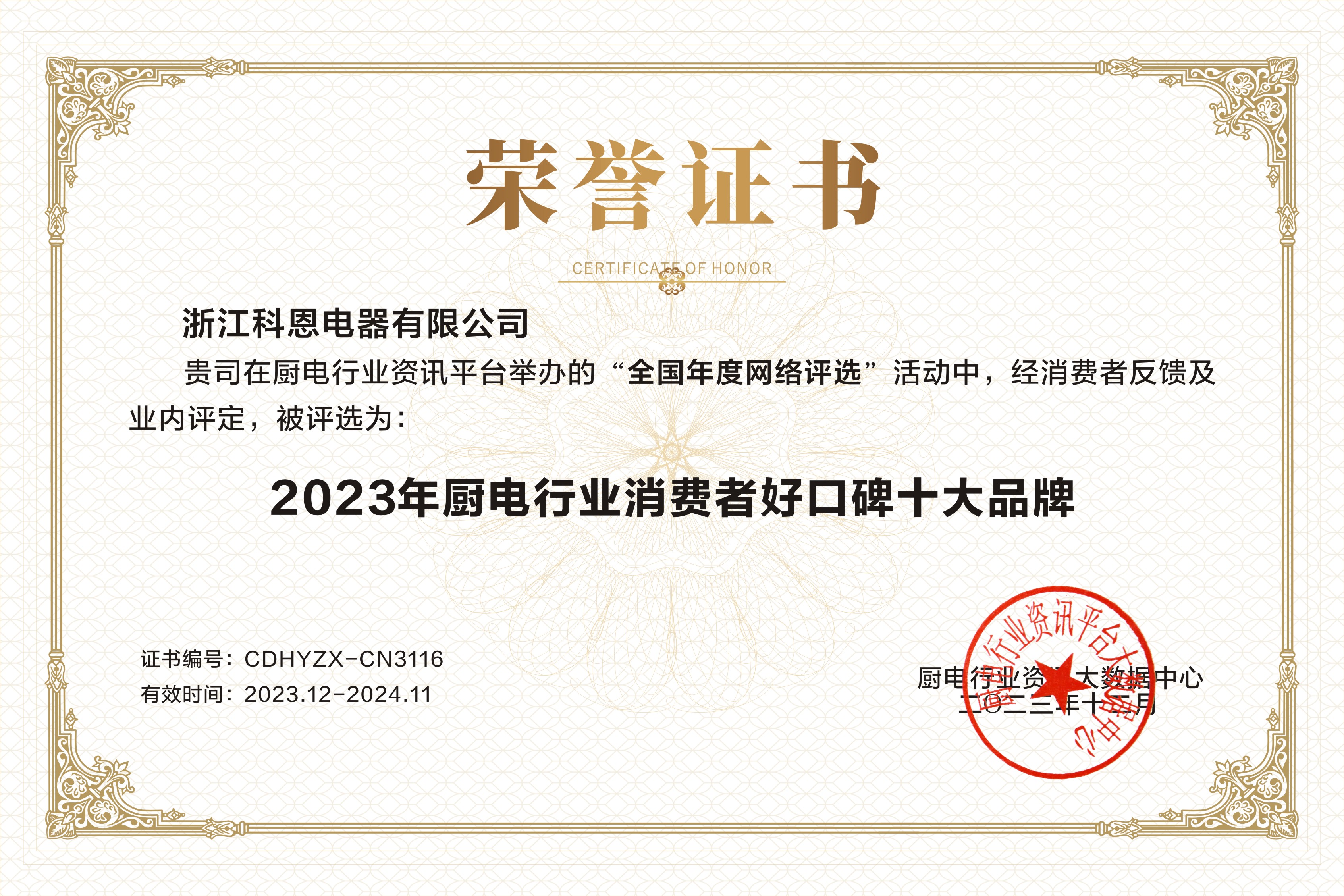 匠心“灶”就精品,品質(zhì)見證實(shí)力!2023年,浙江科恩電器有限公司再次憑借實(shí)力連獲3獎!