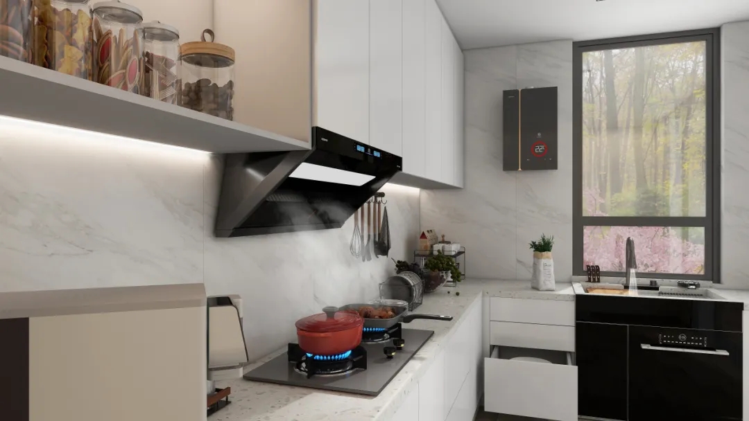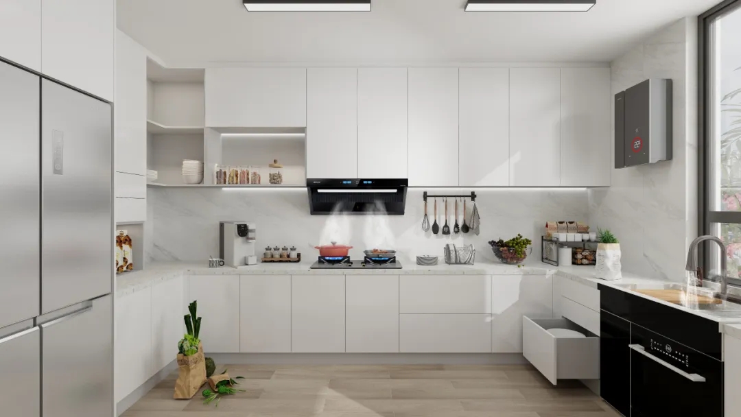煙機方面:科恩5100歐近式超薄油煙機,采用獨特的平嵌式設(shè)計,完美融入櫥柜之中。具備23m³/min颶風(fēng)吸力,可瞬吸濃煙,做到辣味不嗆鼻,妝容不油膩。