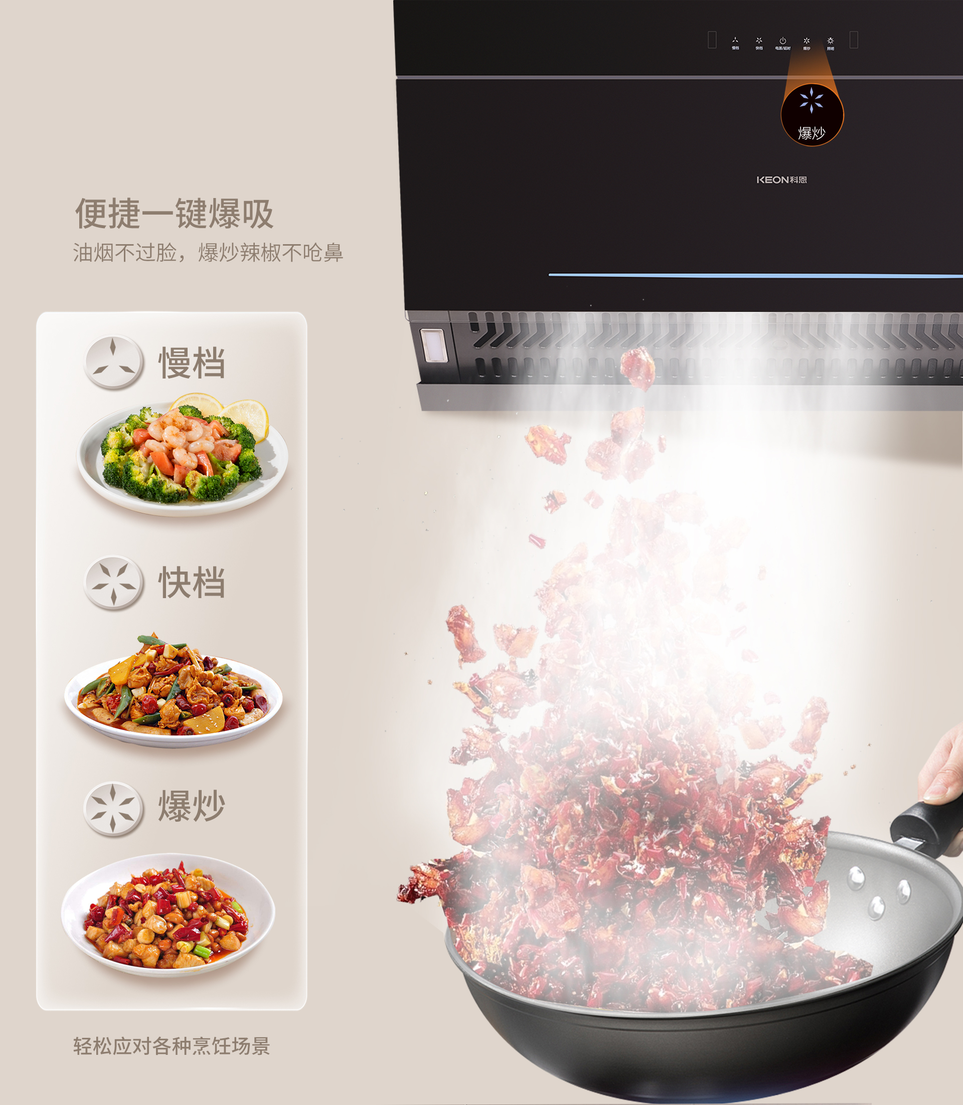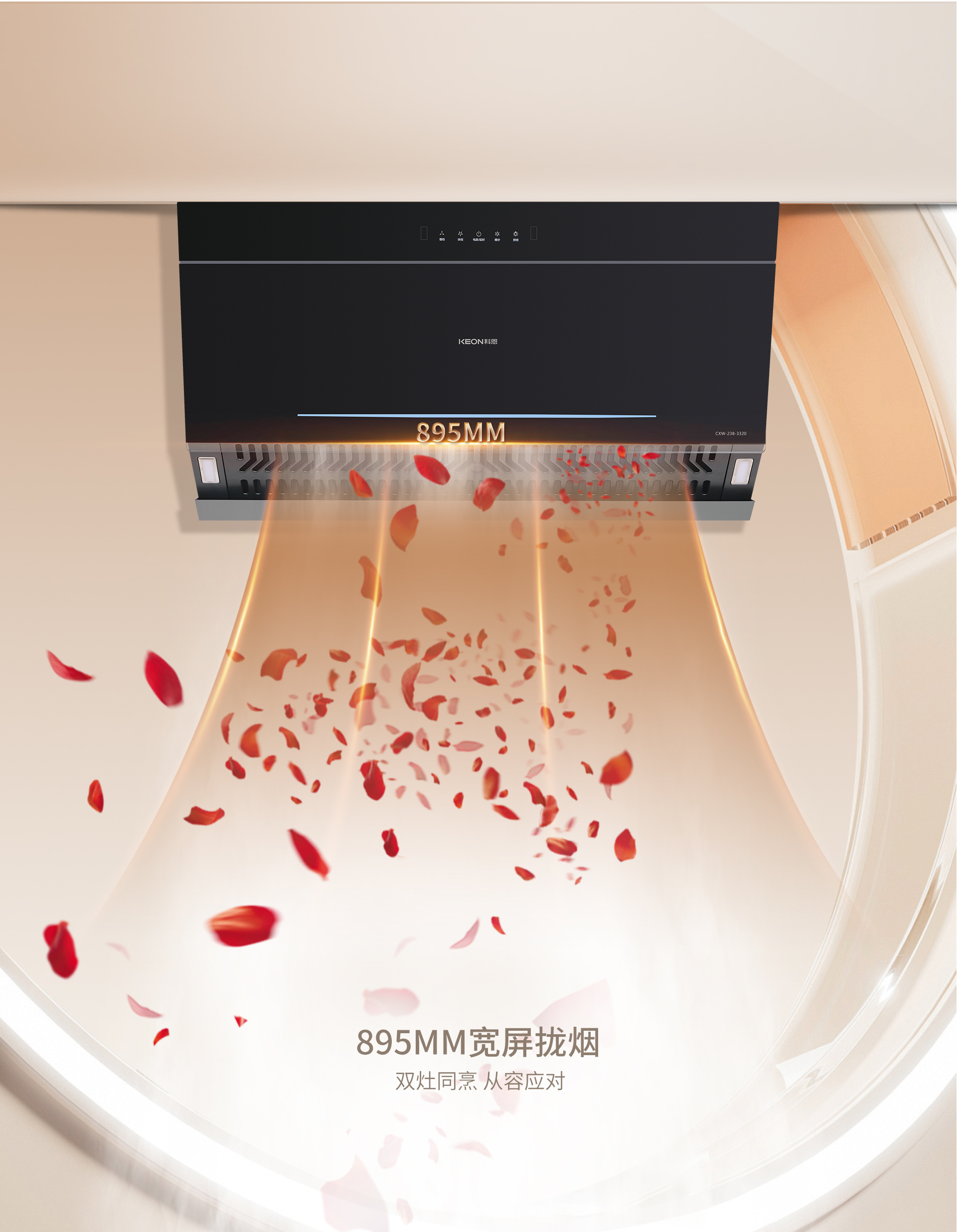 3320的吸煙功能更是重中之重。“260MM低空吸煙”技術(shù),能夠在油煙尚未升騰擴散之時,就將其精準捕捉,從源頭上控制油煙的擴散,讓廚房始終保持清新潔凈。而“895MM寬屏攏煙”則從容應(yīng)對雙灶同時炒菜的情況,寬大的攏煙屏確保油煙不會四處逃逸。具備2檔吸煙模式與爆吸模式,可根據(jù)不同的烹飪場景輕松切換,滿足多樣化的需求。“攏吸排三點一線”的設(shè)計則保證了精準吸煙與暢吸直排,讓油煙的處理過程高效流暢。