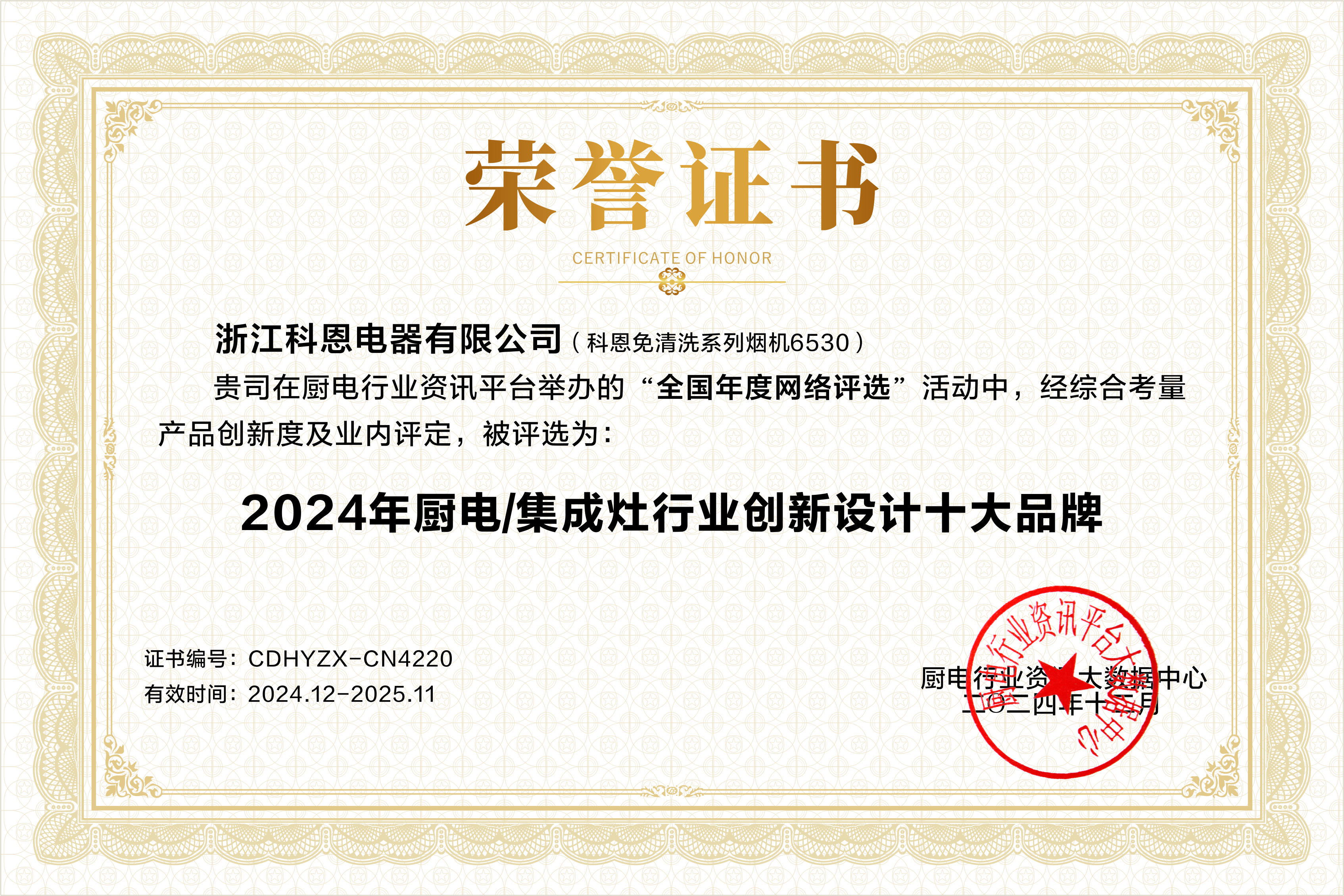 在剛剛過去的2024年,科恩電器更是榮譽加身,榮獲了“2024年廚電行業(yè)影響力十大品牌、消費者好口碑十大品牌、廚電/集成灶創(chuàng)新設(shè)計十大品牌等稱號”。這些殊榮不僅是對科恩電器過去一年在產(chǎn)品研發(fā)、品牌建設(shè)、市場推廣以及客戶服務(wù)等方面所付出努力的高度肯定,更是為其在激烈的市場競爭中贏得了更多的話語權(quán)和競爭優(yōu)勢。