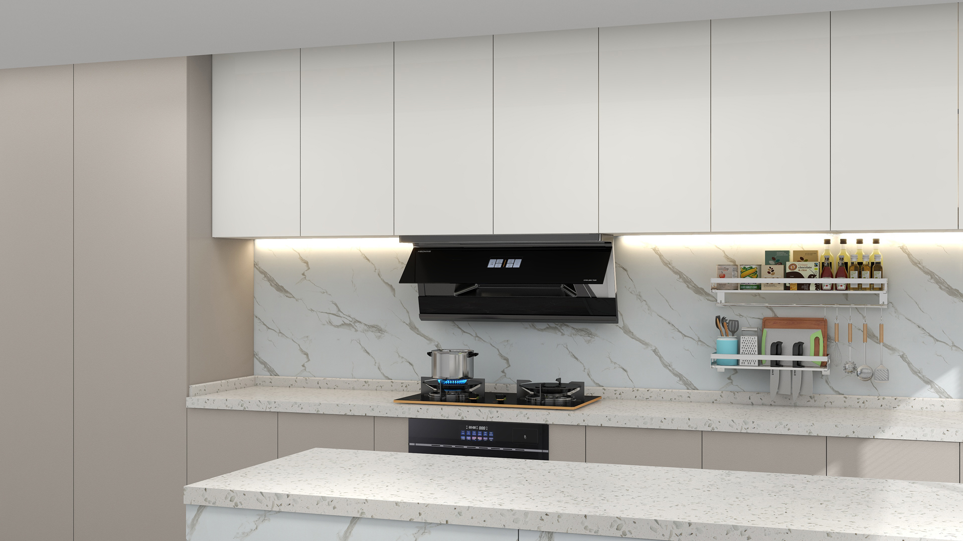 在設(shè)配性上,煙機(jī)7520突破傳統(tǒng)煙機(jī)安裝局限,采用365mm 小圍板結(jié)構(gòu),能夠完美適配多種尺寸的櫥柜。兼顧美學(xué)與實(shí)用性,全黑玻璃面板采用一體化成型工藝,不僅視覺(jué)上時(shí)尚大氣,適配現(xiàn)代簡(jiǎn)約、輕奢等多種廚房裝修風(fēng)格,且表面光滑易清潔,有效降低日常維護(hù)難度。操作層面,模塊化觸摸鍵布局清晰,功能標(biāo)識(shí)直觀,搭配揮手智控技術(shù),無(wú)需觸碰面板即可完成風(fēng)量調(diào)節(jié)等操作,既便捷又衛(wèi)生,滿(mǎn)足了不同年齡段用戶(hù)的使用需求。