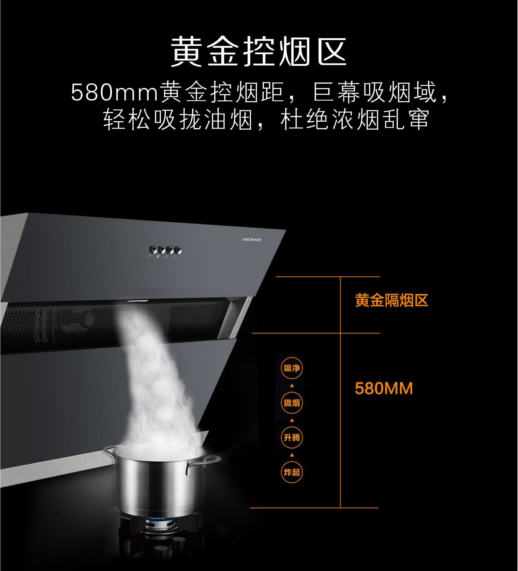 - 580mm黃金控?zé)熅?,巨幕吸煙域,輕松吸攏油煙,杜絕濃煙亂竄。