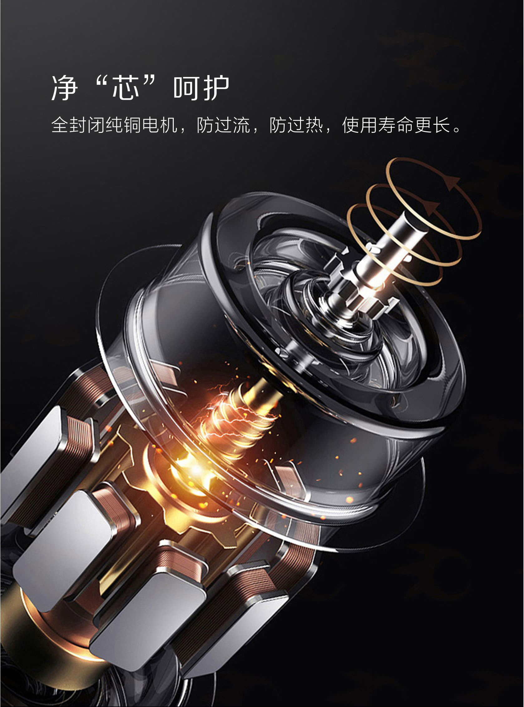 - 凈“芯”呵護(hù),全封閉純銅電機(jī),防過流,防過熱,使用壽命更長。