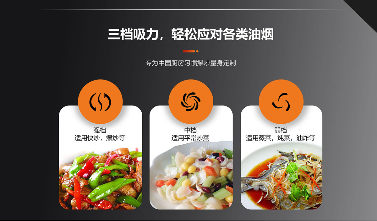 三檔吸力,輕松應(yīng)對各類油煙,專為中國廚房習(xí)慣爆炒量身定制