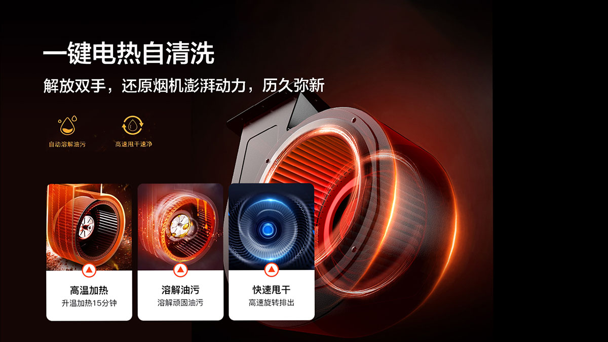 - 一鍵電熱自清洗,解放雙手,還原煙機(jī)澎湃動(dòng)力,歷久彌新