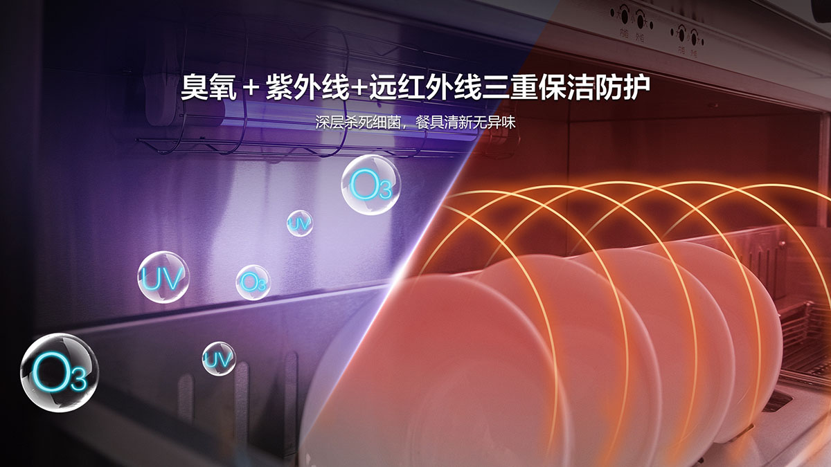 - 臭氧+紫外線+遠(yuǎn)紅外線三重保潔防護(hù),深層殺菌