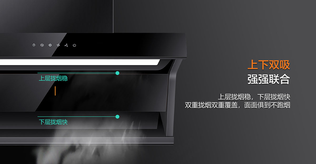 上下雙吸,下強(qiáng)吸,上快攏,強(qiáng)強(qiáng)聯(lián)合,油煙0逃逸